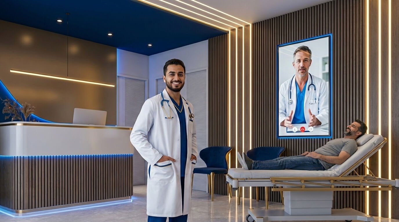 تحضر في الموعد المتفق عليه لجلسة الاستشارة، حيث تتواصل مع الطبيب الأمريكي بحضور الطبيب المحلي الذي يجري لك الفحص السريري ويشرح تفاصيل حالتك